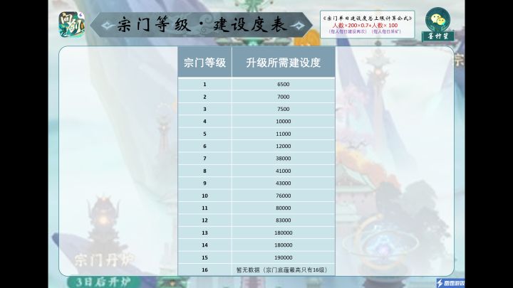 给大家整理了:目前已知的宗门各个等级升级所需要的建设度