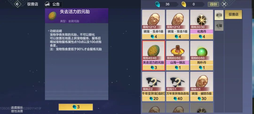 ○ 驭兽争霸商店:失去活力的元胎