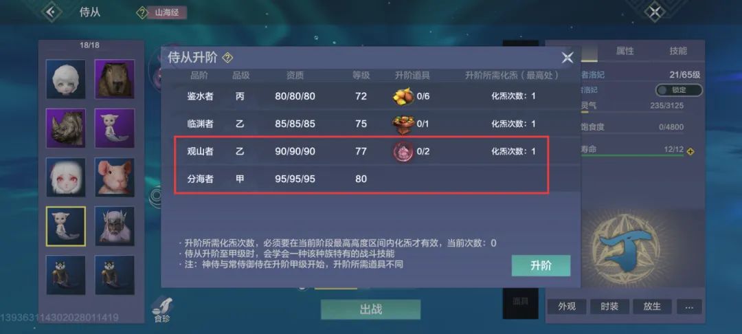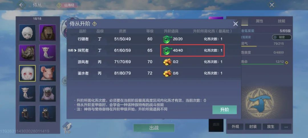 一般而言,侍从品阶提升需要满足2个条件:最高处化炁1次+提供升阶道具。完成在当前阶段最高处化炁1次后,直接点击升阶,提交材料,即可完成侍从升阶。