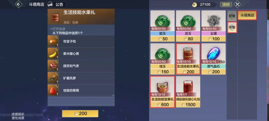 生活技能礼:周活跃奖励-闲适成长礼(必得生活技能水果礼、生活技能坚果礼)、商店-成长、重天斗境商店、游戏内不定时福利活动。