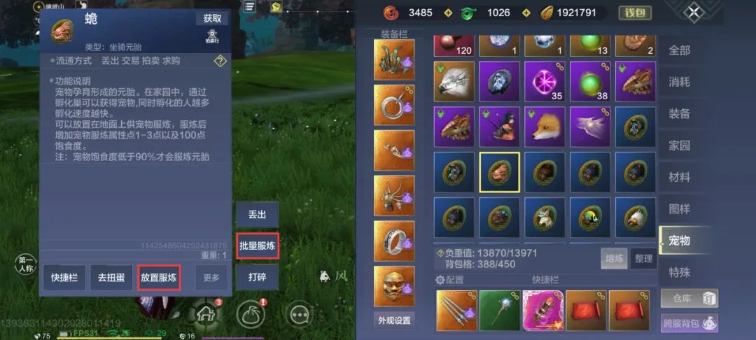 点击背包中的宠物元胎,点击【放置服炼】或【更多-批量服炼】即可让宠物吞食元胎。这里推荐使用蓝色元胎(坐骑元胎、小伙伴元胎)作为服炼材料,蓝色元胎获取简单,培养服炼的成本更低。
