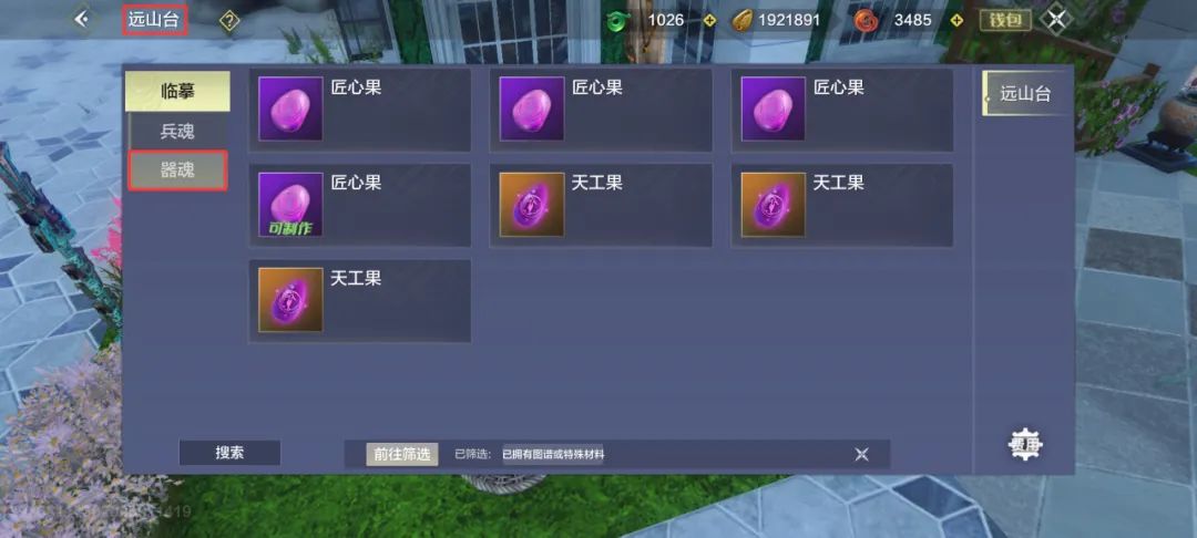 ● 普通器魂:①打游侠掉落;②【远山台-临摹-合成-器魂】,选择匠心果制作,可获得随机品质的器魂。