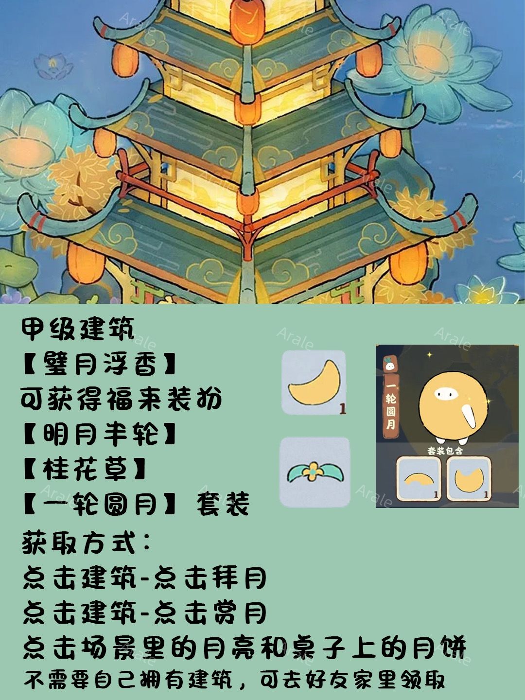 9.甲级建筑【璧月浮香】可获得福来装扮【明月半轮】【桂花草】【一轮圆月】套装