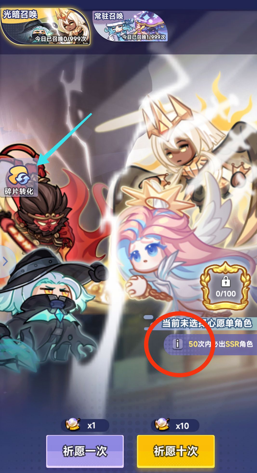 点击红圈中符号可以查看卡池,碎片兑换是一些卡满星后的碎片可转换为兑换商城中的货币(用处挺大)