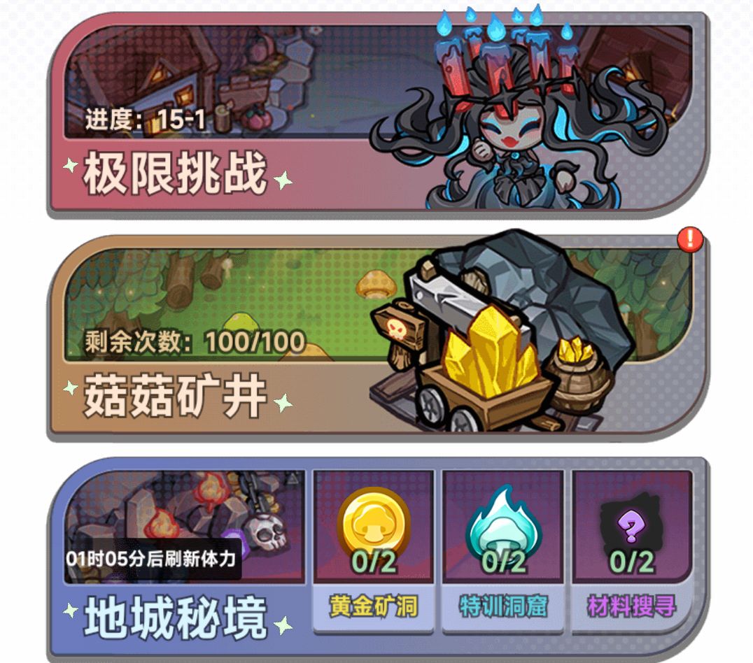 极限挑战,尽量往上爬奖励逐渐丰厚。地城秘境随闯关进度开放。矿井会有少量体力钻石产出但奖励不随深度增多