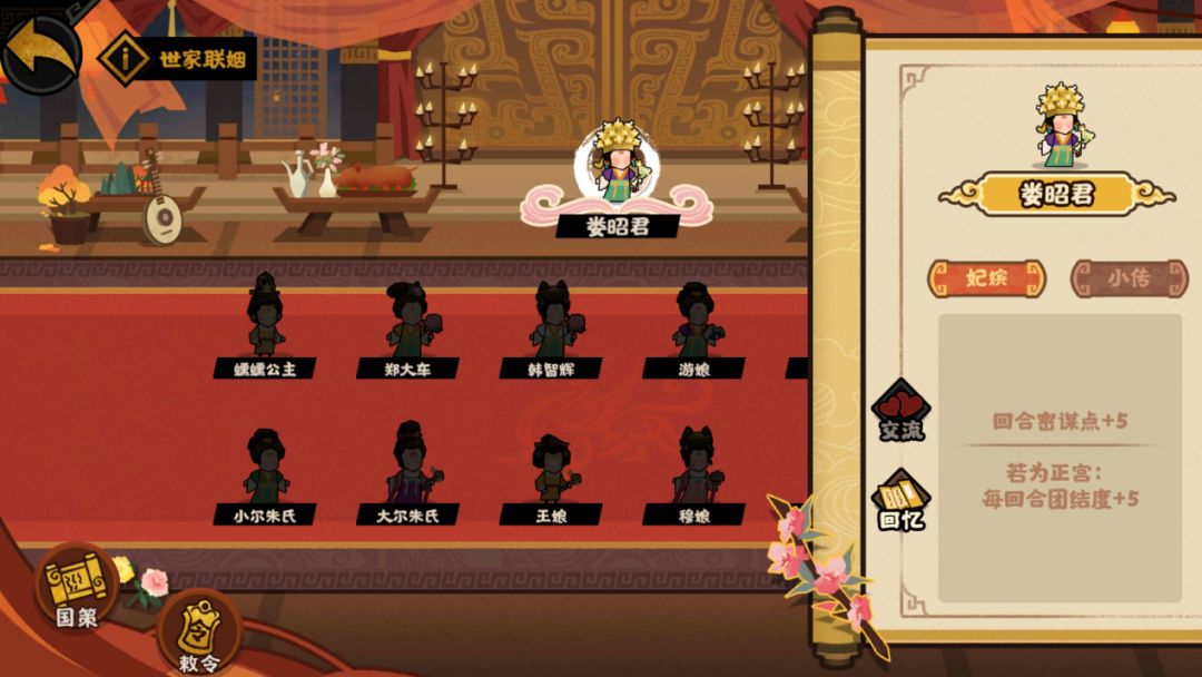 在世家联姻界面,王上可以通过点击对应的小人,了解对方的加强效果以及历史小传,还可以通过回忆与交流,了解相关剧情故事哟,同时各位妃嫔也会不定时说一些悄悄话呢~