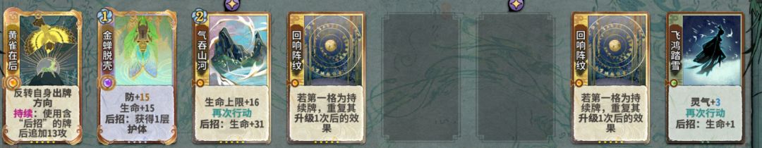 黎承云·曳影剑阵:在黎承云先天共鸣中有某几张关键的灵剑卡牌时,这个仙命可以为我们带来非常不错的灵气收益,每轮一次回蓝约等于聚灵心法的效果,同时也提升了卡组的灵活性。