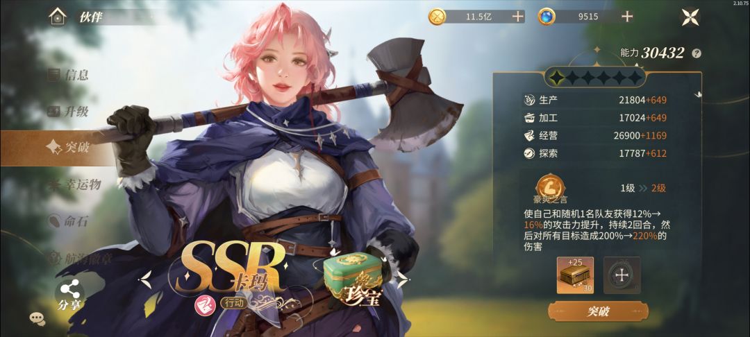 伙伴突破,可以大幅度提升属性、谈判能力!