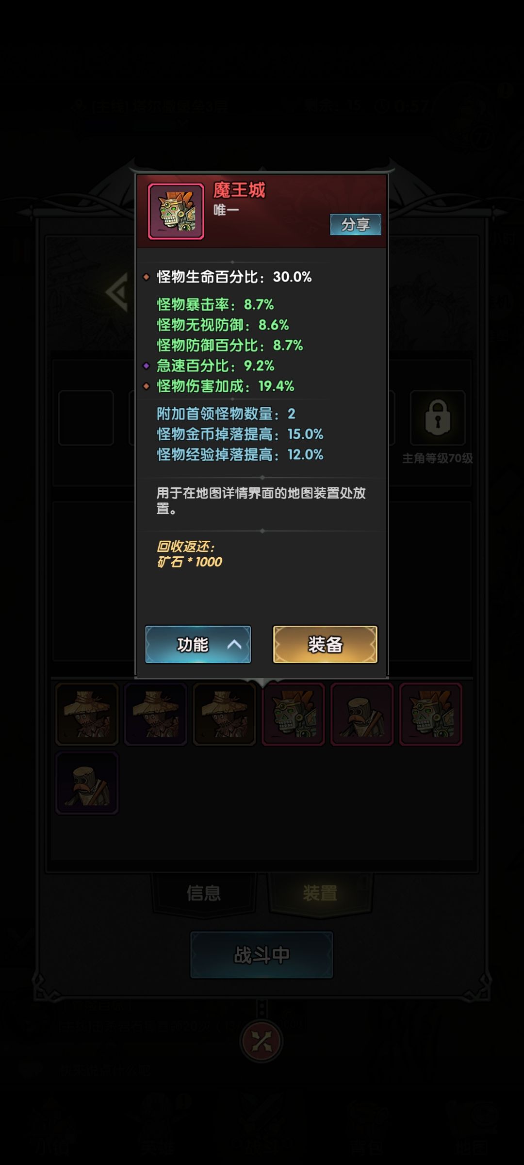 地图装置:只在刷最高经验等新纪录的时候带,比如图25,图29,图34,是前期可以刷很久的图,刷出最高经验就下了,因为目前地图装置也会增强副本boss。殖装的选择也很简单,就是选怪物防御属性加的少的,防御属性包括:格挡,防御,平衡,韧性,血量这些。