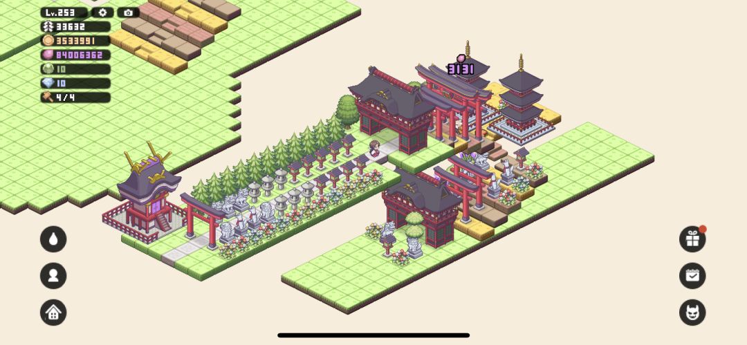 反复优化,最后实在没有优化空间了,剩一个鸟居怎么也塞不进多倍区了,一个大神门等于三个鸟居,这里3倍区总共有7个鸟居的位置+两个三重门,2倍区有5个鸟居的位置+8个R级建筑,应该是极限了,大家照着这个一定能前进几关。下面有个狮子戴了两顶绿帽子,是防止小怪掉狮子头上。
