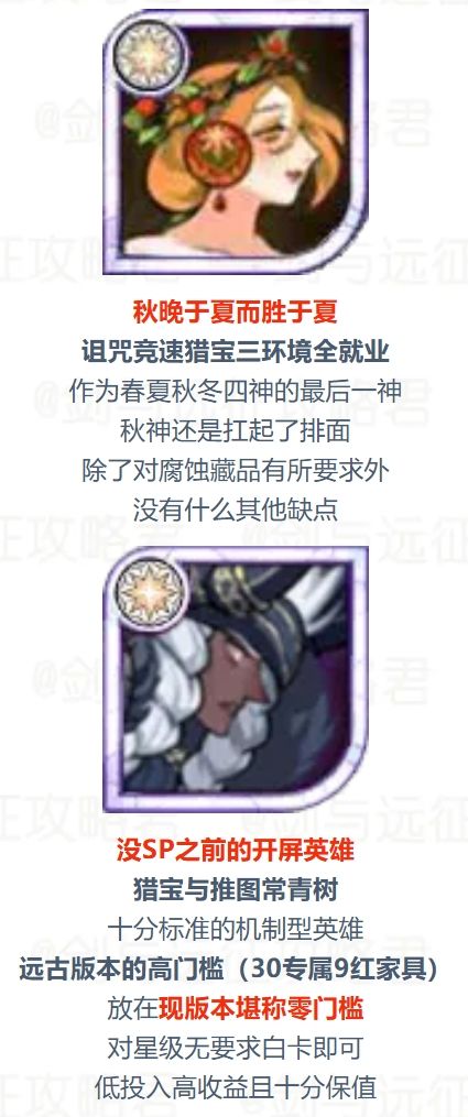 最新的一个神魔英雄是魔匠,目前各环境验证下来强度在线。再上一个神魔英雄就是秋神了,只能说神魔英雄更新的确实很慢,毕竟现在除了神魔英雄之外,还有四族英雄、SP英雄、龙族英雄排队。偶尔还要插一下联动虚空或者是原创虚空,导致神魔英雄的间隔十分长。并且由于占星券的投放没有SP券多,后面的神魔英雄强度慢慢也进行了上调。加上间隔长 神魔英雄变相保值。所以现在占星券的投资依旧珍贵。那么就让我们一起来看看最新版的投资建议吧。