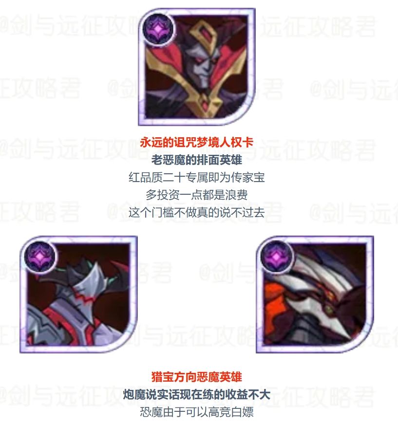第三梯队:黄毛(红30)>魅魔(单紫)>蓝脸(偏PVP)蓝脸不着急的可以先补双子品质到红卡