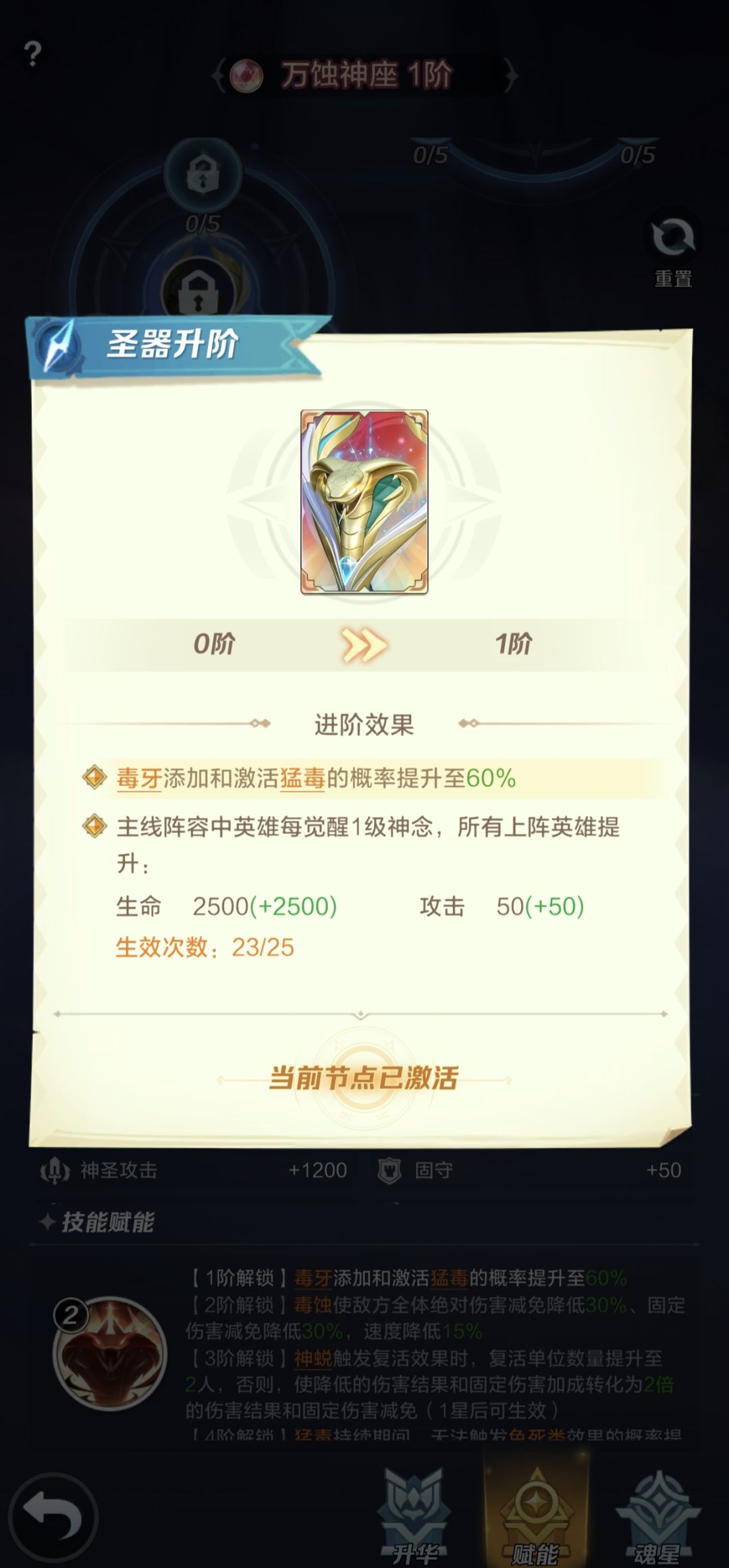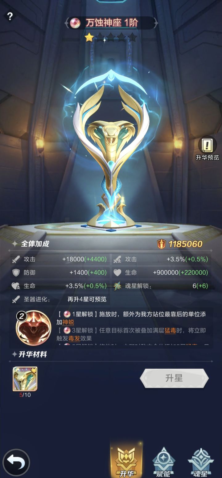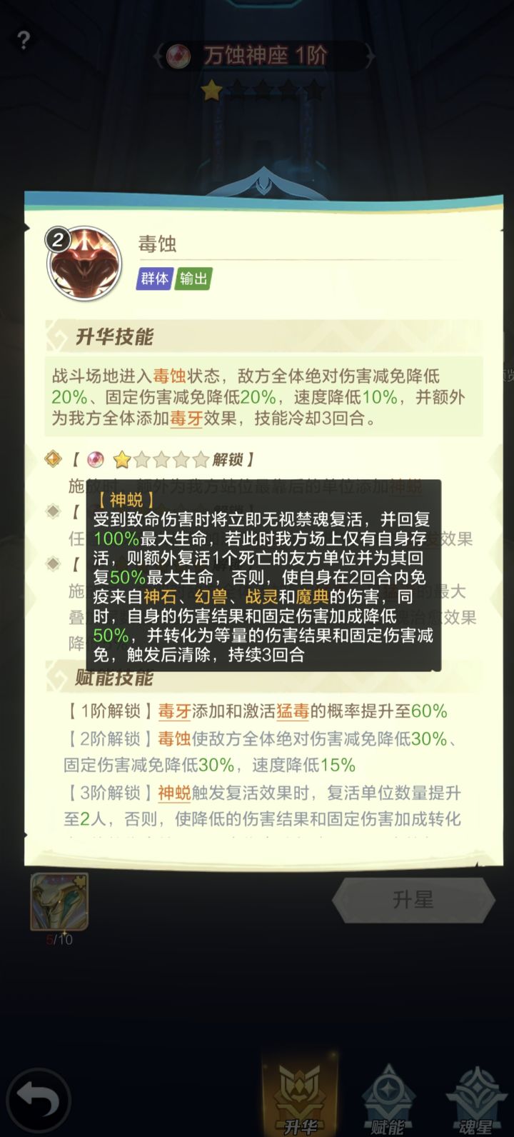 。也是绕远了,回正题—— 神蜕,站位最靠后的英雄,死亡无视禁魂复活,我方只剩1人时,多复活1个,否则免疫除英雄外的硬件攻击。当前版本下极为强势的复活技能,关键时刻能扭转战局,不过受益的是最靠后单位,因此V,T,+字站位较为推荐(我个人是V阵)。蛇头升1星的优先级强化更高,远大于其他圣器。