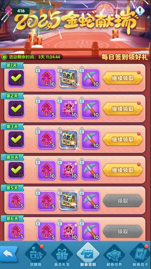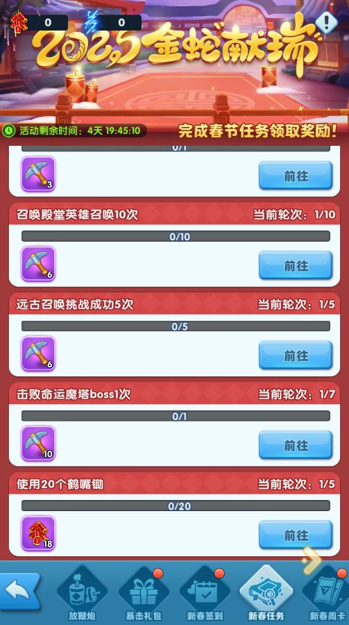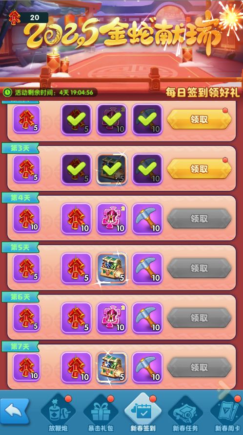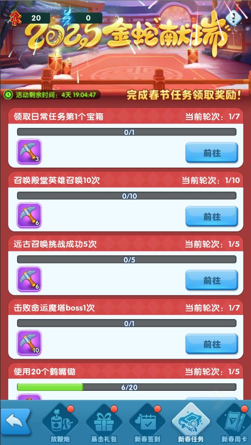 🧧新春任务:活动期间,完成任务可获得新春鞭炮和鹤嘴锄,使用可增加放鞭炮和幸运挖宝的进度获得奖励。