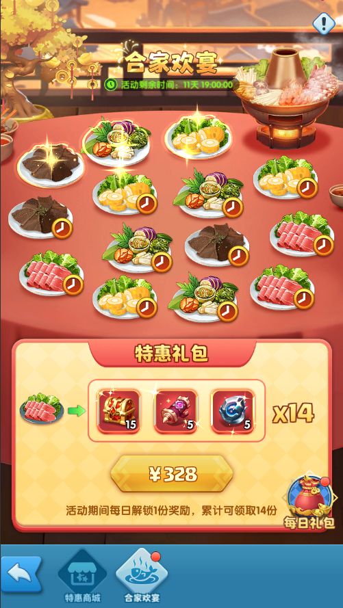 🧧合家欢宴:活动期间,购买礼包即可每日解锁一份奖励,累积可获得14份奖励。