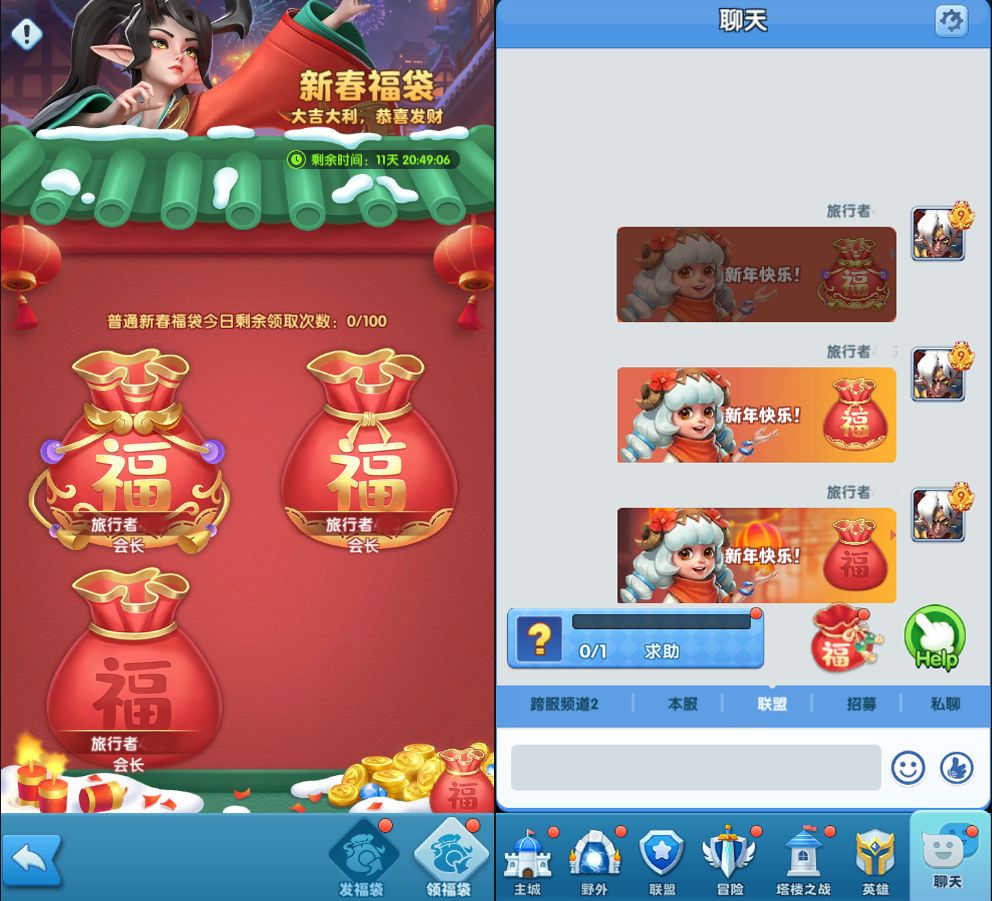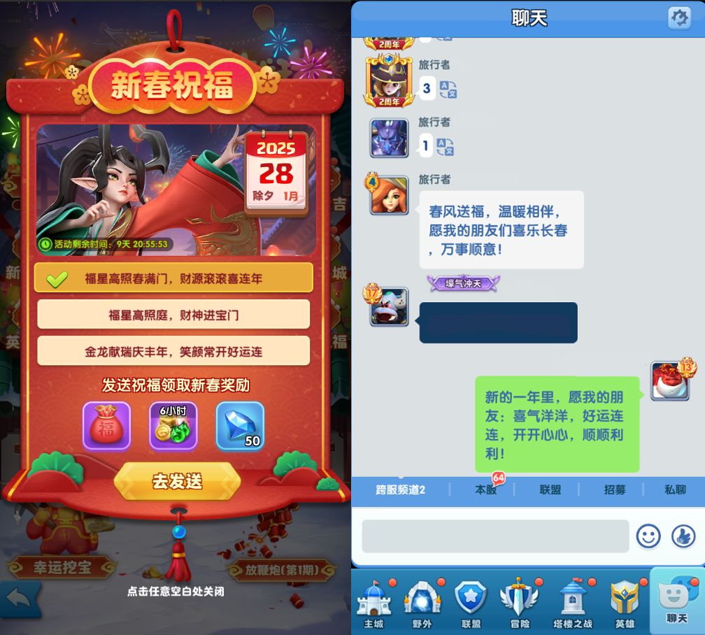 五、新春祝福🧧活动期间,每日登录发送祝福至频道,可获得一份祝福奖励。