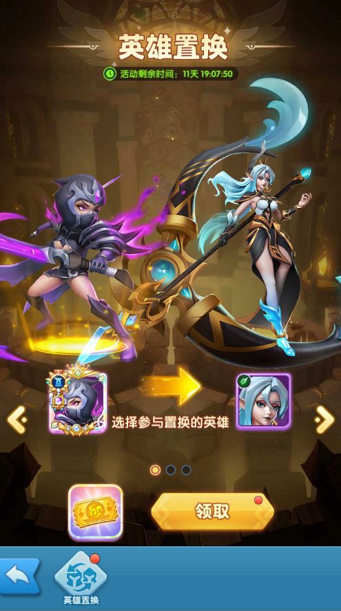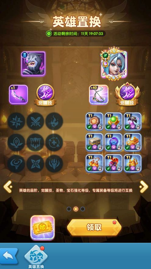 八、英雄置换🧧参与活动可获得限定道具英雄置换券,使用英雄置换券能让两个英雄的品质,觉醒技,专属装备,圣物及等级,宝石等级互换。