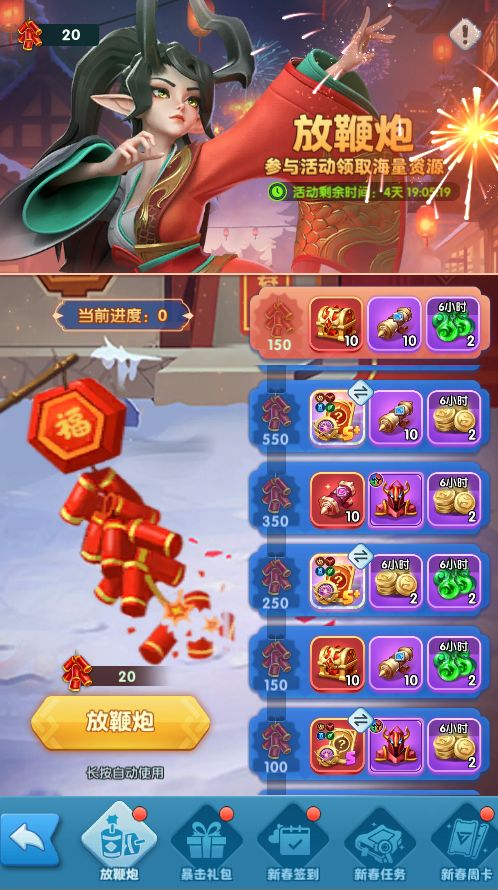 三、新春大吉🧧放鞭炮:活动期间,可以通过燃放鞭炮增加进度,完成对应阶段时可获得阶段奖励,有机会获得四系S+英雄/圣物自选卡哦~