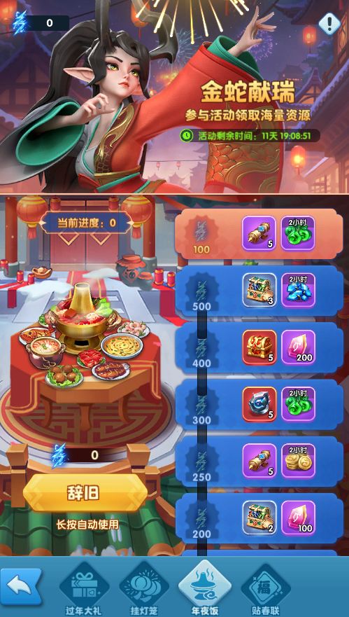2、年夜饭:活动期间,使用辞旧体力可增加年夜饭的进度,完成对应阶段时可以获得阶段奖励。