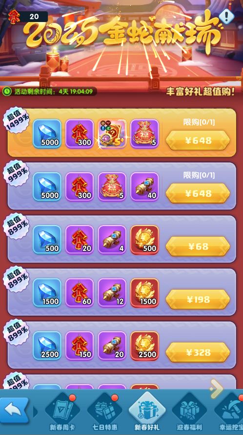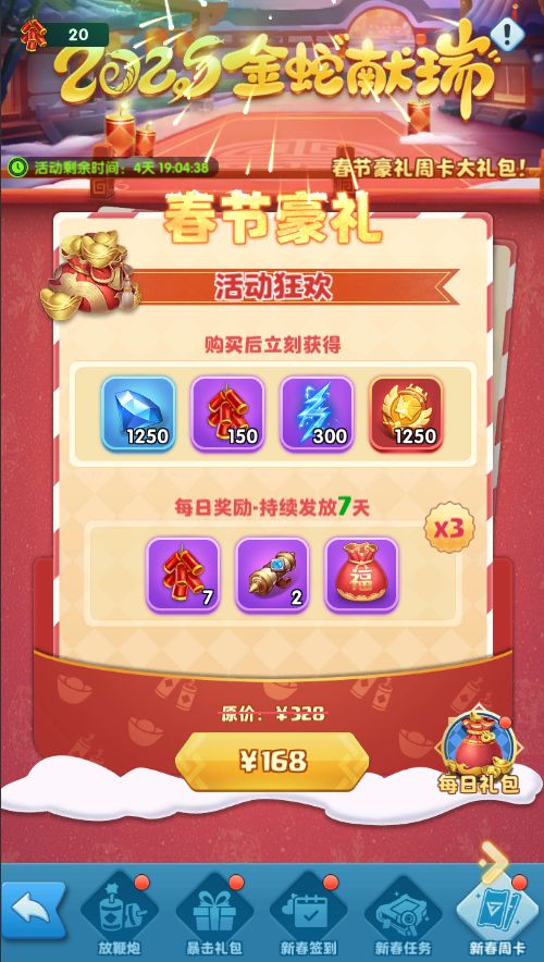 以下活动分两期进行:【放鞭炮】、【新春签到】、【新春任务】、【新春周卡】、【七日特惠】、【新春好礼】