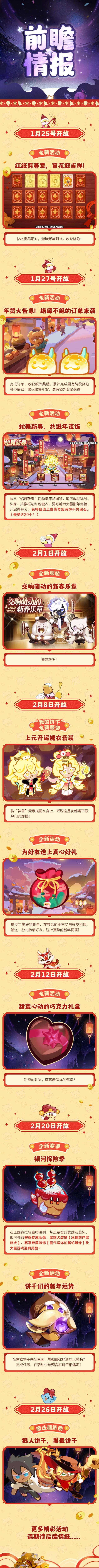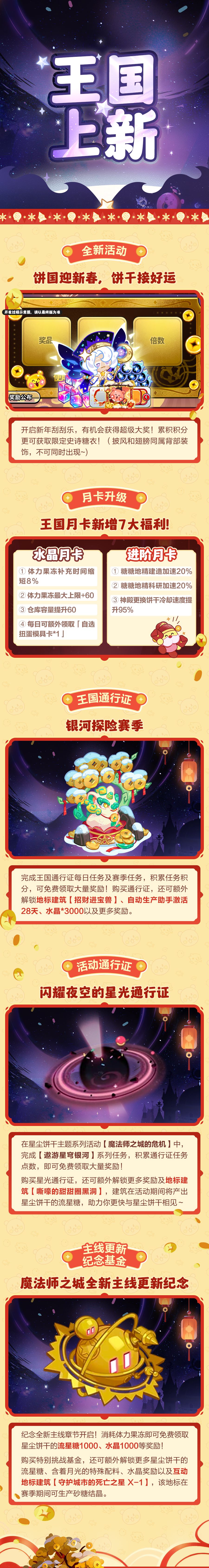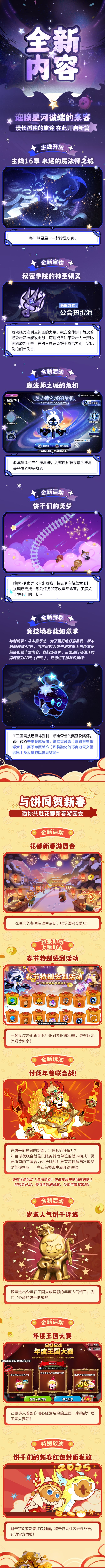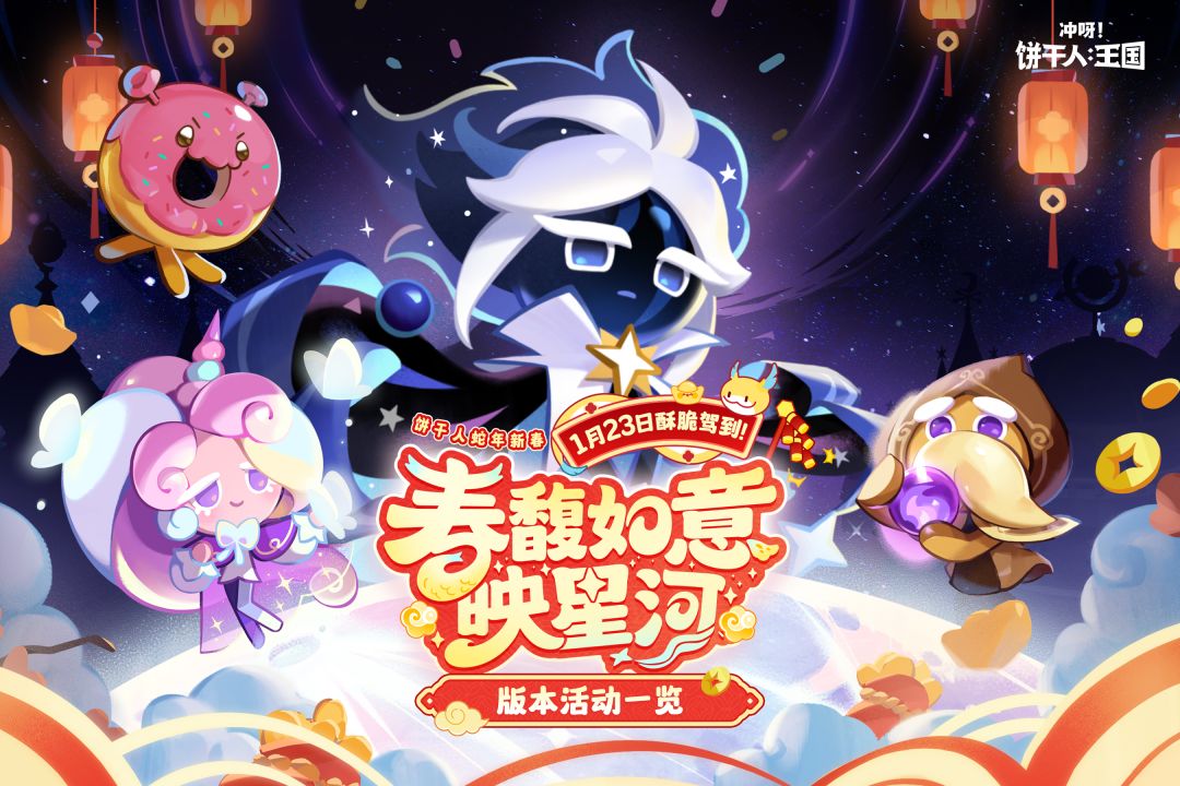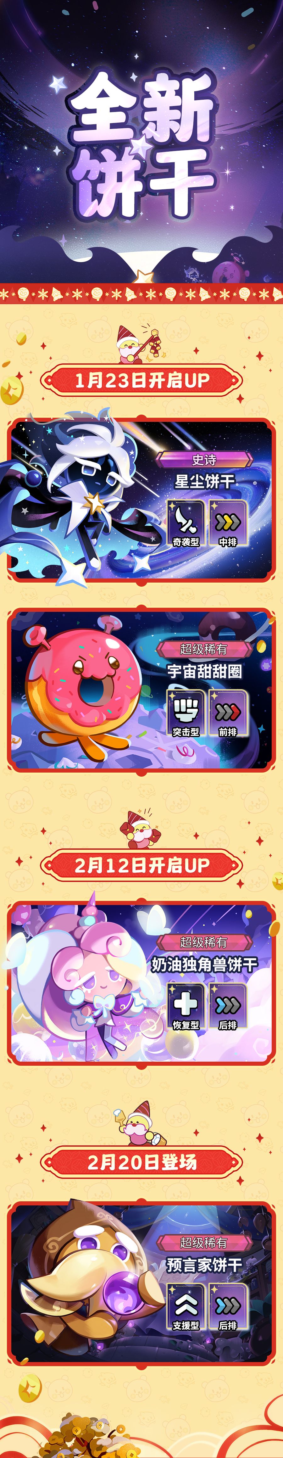 全新春节版本「春馥如意映星河」将于1月23日开启,奇袭型「史诗」星尘饼干、突击型「超级稀有」宇宙甜甜圈、恢复型「超级稀有」奶油独角兽饼干、支援型「超级稀有」预言家饼干将至,第16章节主线将启。全新“讨伐年兽联合战”展开激斗!又有谁会在“岁末人气饼干评选”、“年度王国大赛”摘得桂冠?与你共同见证!