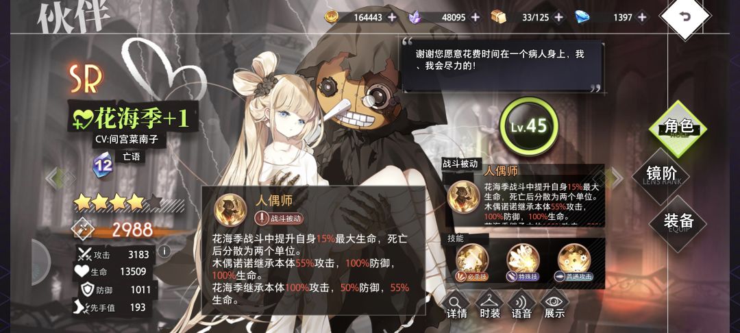 丽姬娅登场可以驱散我方全体弱化效果,如遇到敌方有毒奶诅咒有奇效,同时大招作为一个全体aoe倍率较为可观,更有多种debuff挂给对方,非常推荐的角色。夏目倍率可观,触发红刀倍率更是可怕,前期强力角色平民战神,非常推荐,香缇十秒无敌,需要前排承伤的场合适合出场,不需要资源就能承受大量伤害,推荐。玛丽登场提升手牌全体输出,buff机,必杀对一列敌人造成伤害非常优质,同时需求能量低,与香缇一样只要8点能量,非常推荐。潘被动也非常强力,早期登场能获取大量攻击力,如果能直接打到敌方队长,表现会非常优异,非常推荐。sr角色安如果抽到的话也是非常推荐,卡组技能配合小夜即可激活,buff非常不错,大招的机制使得承伤能力也较为可观,优质角色。如果没抽到上述角色,那么米仓千代,安妮等等角色也是不错的选择,可堪一用。