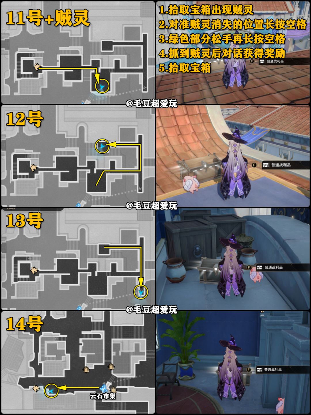 简略版:拾取宝箱→出现贼灵→长按空格回溯抓贼灵(绿色:松手+长按空格)→抓到贼灵后对话/战斗→获得贼灵奖励→别忘记拾取宝箱。
