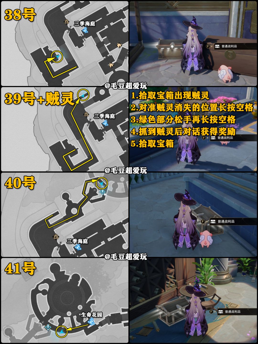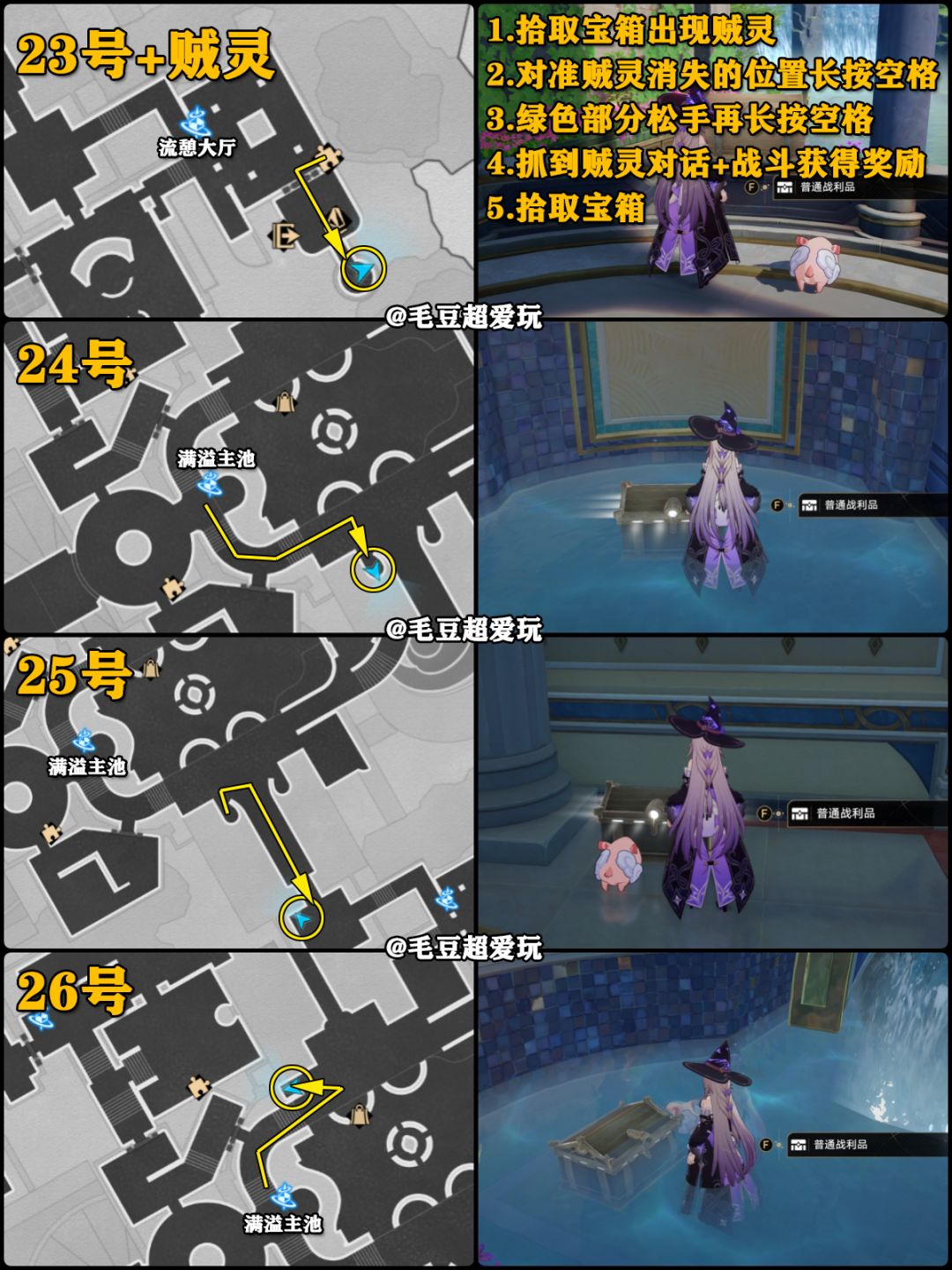 简略版:拾取宝箱→出现贼灵→长按空格回溯抓贼灵(绿色:松手+长按空格)→抓到贼灵后对话/战斗→获得贼灵奖励→别忘记拾取宝箱。