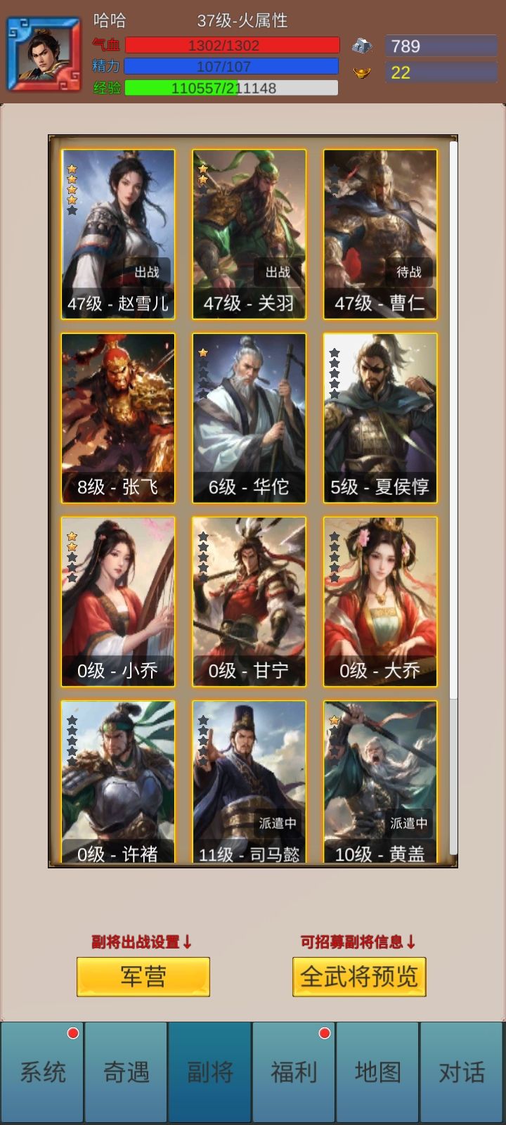 玩了三天是个萌新,前期一定要选好想要培养的武将,控制输出将优先,辅助功能后期再看,个人是赵飞燕速度比关羽快一点,然后开局秒一个打,主角全体力加点,将死了不慌点招将可以很快度过前期