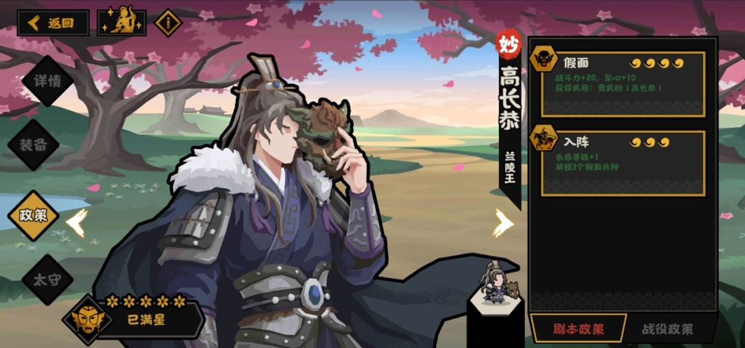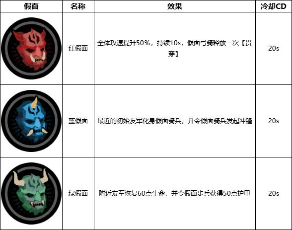因为战斗中谋略每8s回复一点,足够高长恭循环自身假面政策,假面的具体效果比较复杂,可单独使用,更推荐搭配假面兵种使用,具体效果可参照下表