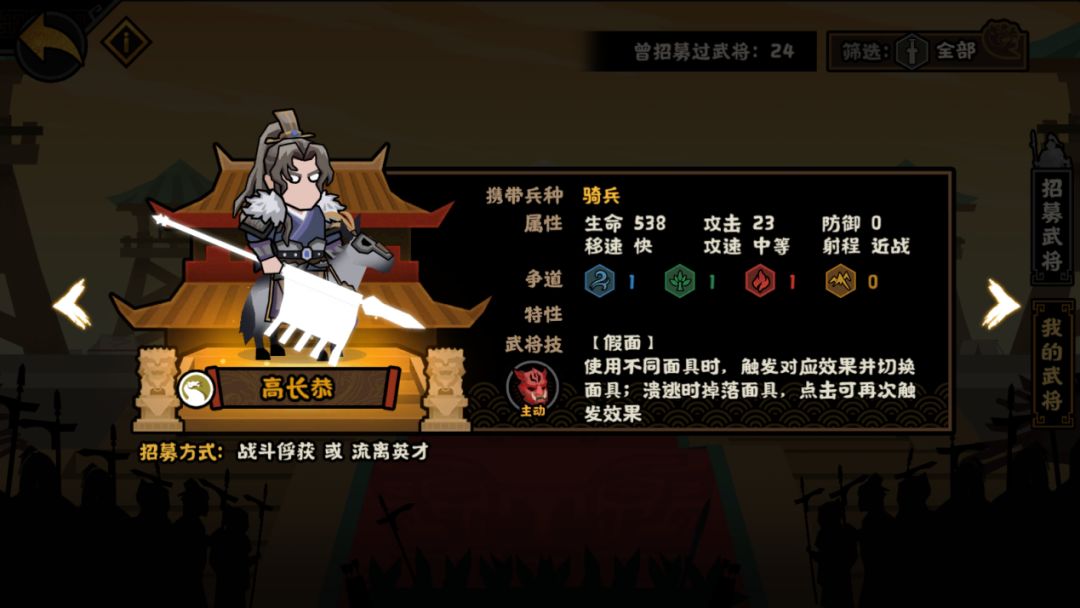 然后回到武将本身,高长恭的武将技为【假面】,假面使用需要3点谋略,使用后切换为另一种假面,冷却时间为20s。若高长恭溃逃,则假面会掉落,点击掉落假面可再次触发掉落假面的效果。