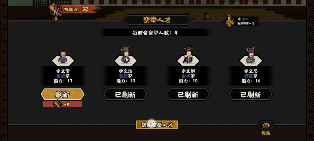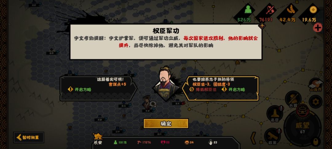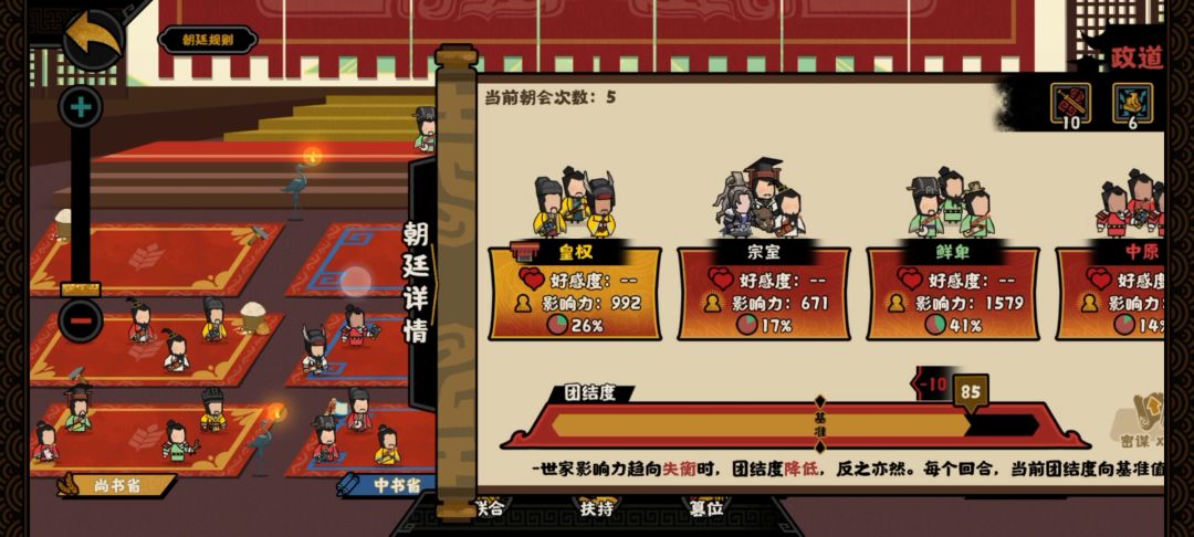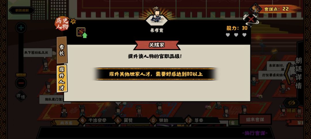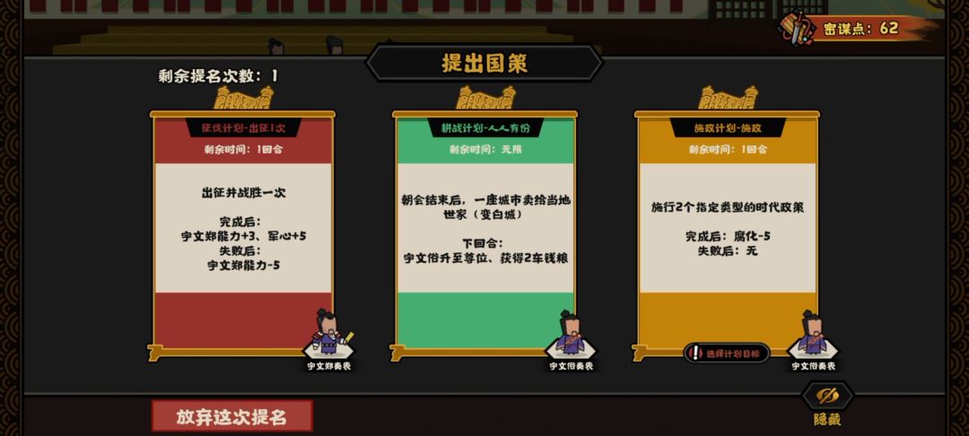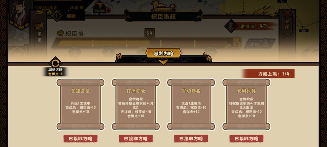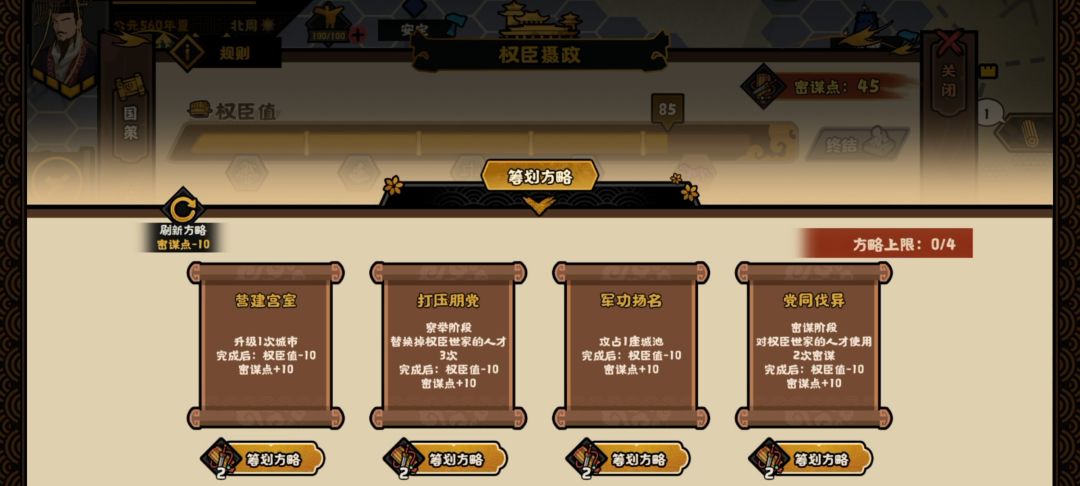 点击权臣摄政那里可以消耗密谋点筹划方略。这个也不是特别难。