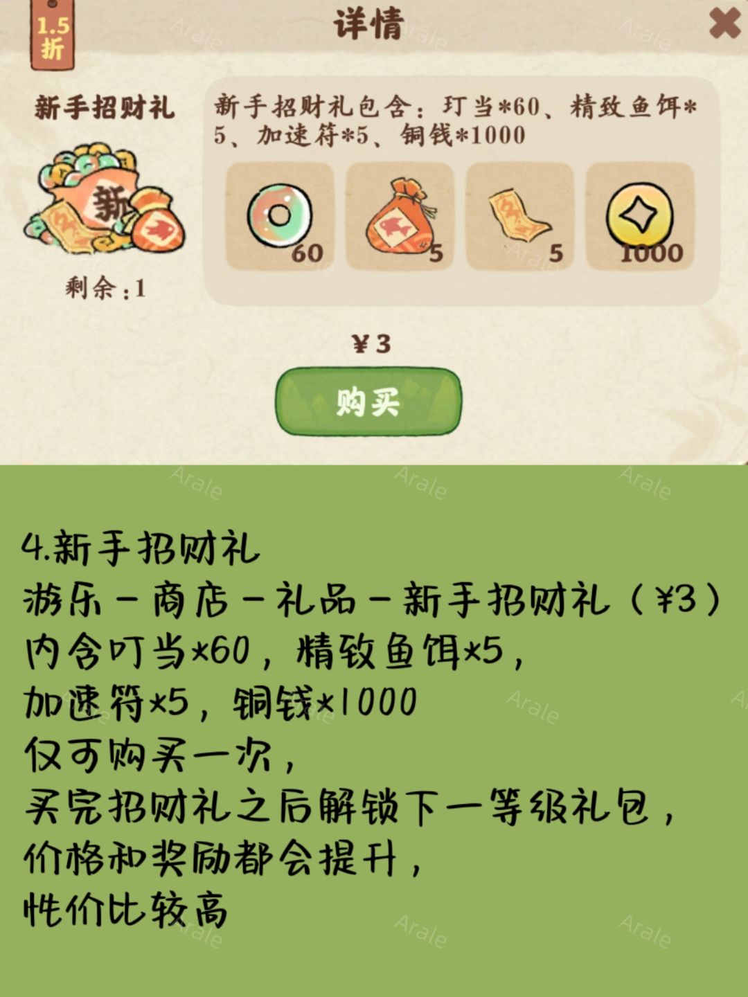 4.新手招财礼:游乐—商店—礼品—新手招财礼(¥3),内含叮当*60,精致鱼饵*5,加速符*5,铜钱*1000(仅可购买一次,买完招财礼之后解锁下一等级礼包,价格和奖励都会提升,性价比较高)