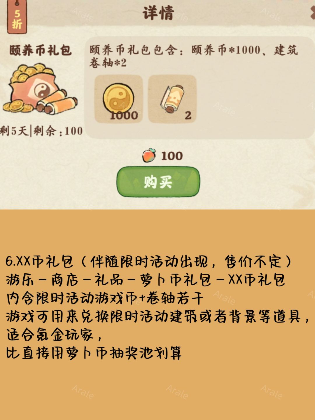 6.XX币礼包(伴随限时活动出现,售价不定):游乐—商店—礼品—萝卜币礼包—XX币礼包,内含限时活动游戏币+卷轴若干(游戏可用来兑换限时活动建筑或者背景等道具,适合氪金玩家,比直接用萝卜币抽奖池划算)