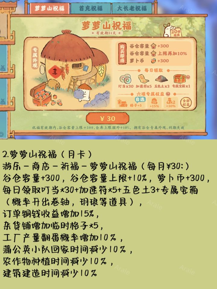 2.萝萝山祝福(月卡):游乐—商店—祈福—萝萝山祝福(每月¥30:):谷仓容量+300,谷仓容量上限+10%,萝卜币+300,每日领取叮当*30+加速符*5+五色土3+专属宝箱(概率开出卷轴,玥琅等道具),订单铜钱收益增加15%,杂货铺增加临时格子*5,工厂产量翻番概率增加10%,蒲公英小队回家时间减少10%,农作物种植时间减少10%,建筑建造时间减少10%