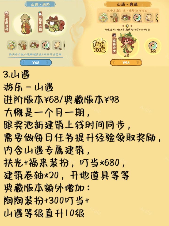 3.山遇:游乐—山遇(进阶版本¥68/典藏版本¥98)大概是一个月一期,跟奖池新建筑上线时间同步,需要做每日任务提升经验领取奖励,内含山遇专属建筑,扶光+福来装扮,叮当*680,建筑卷轴*20,开地道具等等(典藏版本额外增加:陶陶装扮+300叮当+山遇等级直升10级)