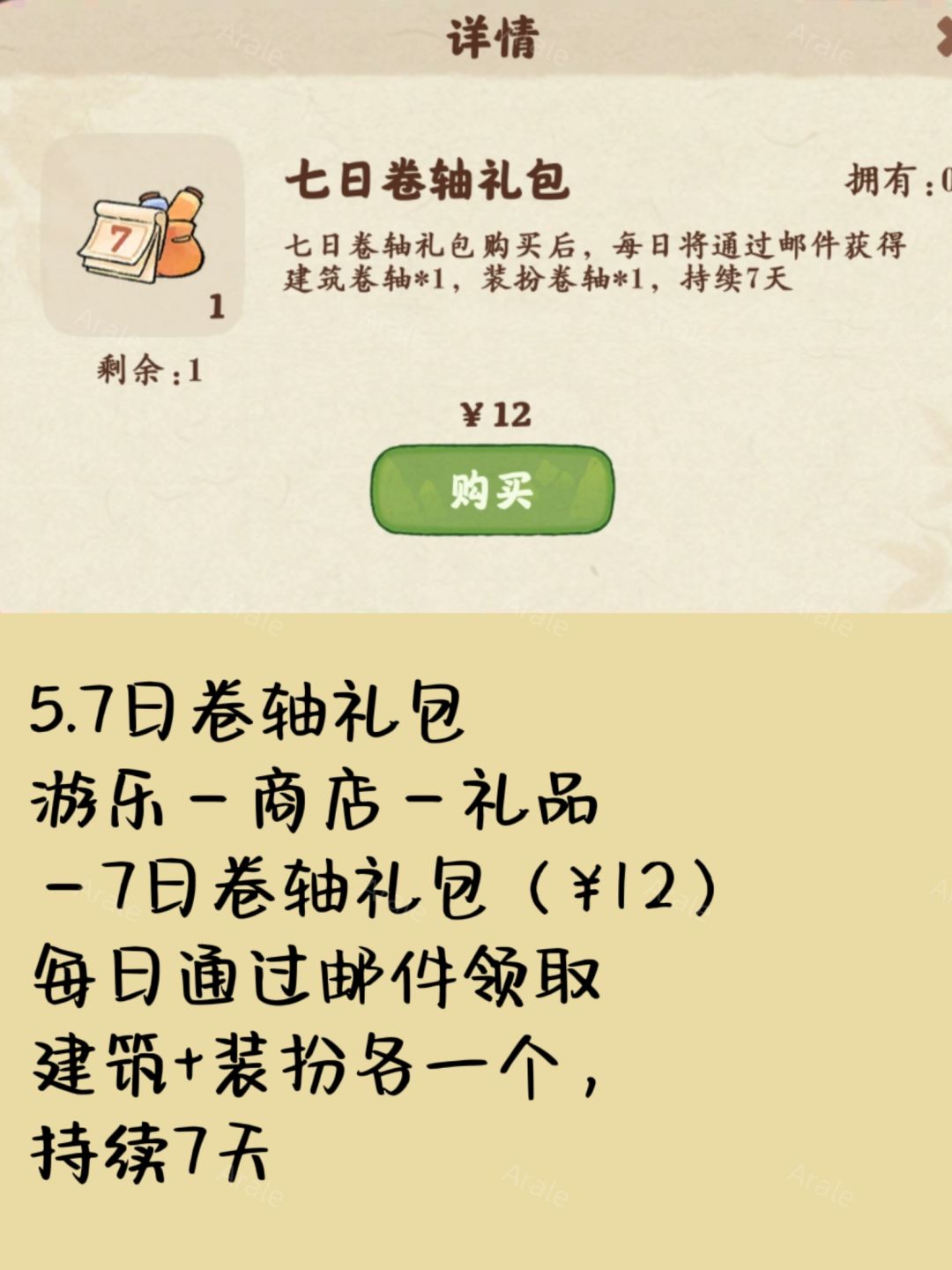 5.7日卷轴礼包:游乐—商店—礼品—7日卷轴礼包(¥12):每日通过邮件领取建筑+装扮各一个,持续7天