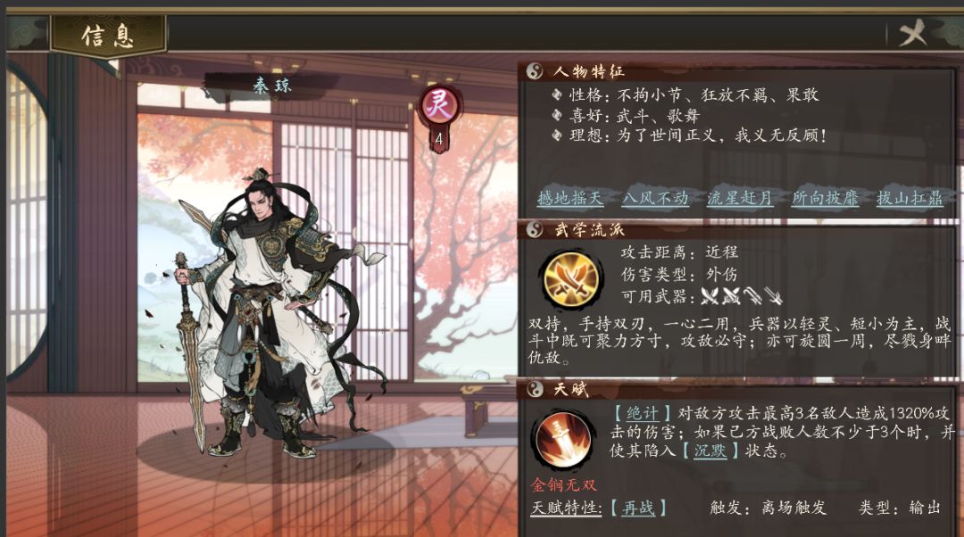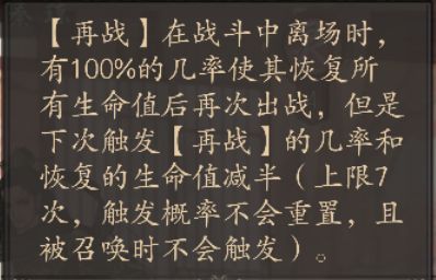秦琼的天赋特性为【再战】,在战斗中离场时,有100%的几率使其恢复所有生命值后再次出战,但是下次触发【再战】的几率和恢复的生命值减半(上限7次,触发概率不会重置,且被召唤时不会触发)。