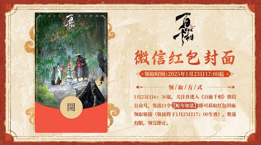 ①1月23日16:30起,进入《百面千相》微信公众号,发送口令【蛇年如意】,即可获取红包封面领取链接;