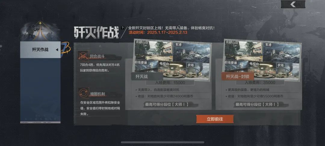 活动期间,地图界面或活动玩法中选择【歼灭战】,支付15000柯恩币即可进入歼灭战。选择【歼灭战-封锁】,支付35000柯恩币即可进入歼灭封锁区。