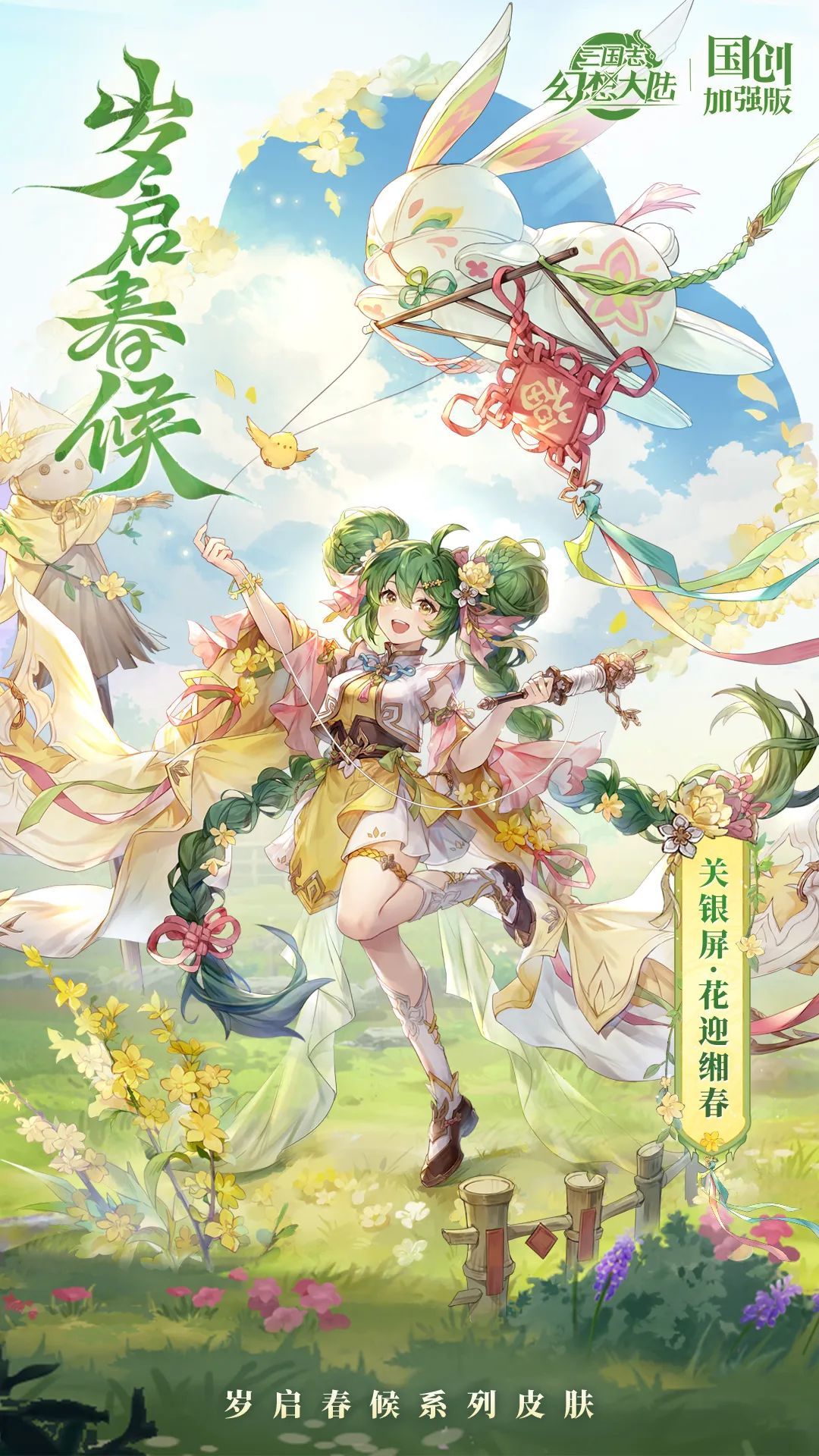 皮肤以鹅黄色为主色调,以春分时节放风筝为主题,画面色彩丰富,充满生命力。春分时节,大地一片生机盎然,关银屏身着鹅黄色的新衣,带着新做好的兔子风筝,快乐地奔跑在春日的原野上,雀跃的步伐带着少女特有的天真!