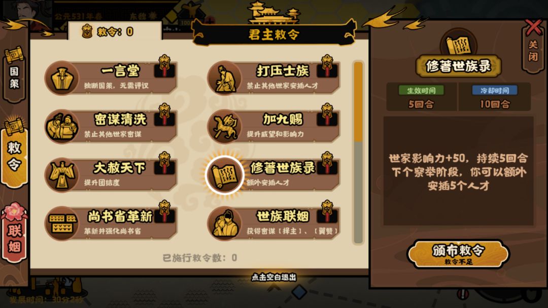 达成妃嫔数量的次要目标后,我们最后需要考虑的便是提高高家的影响力,这边可以考虑使用活用君主敕令玩法,利用例如【修著世族录】来额外安插人才从而提升影响力,后续可以使用【加九赐】、【密谋清洗】之类的敕令,保持并稳步提升自身世家的影响力;