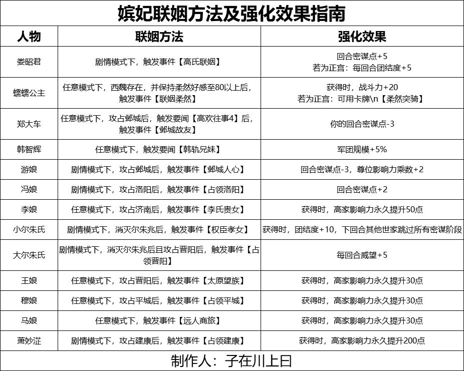 达成主要目标后消灭西魏后,可以把精力投入到次要目标当中,其中世家联姻嫔妃数量,顺着剧情就能轻松达成8位的要求,全嫔妃获取也可以参考下表或者我的世家联姻玩法介绍攻略