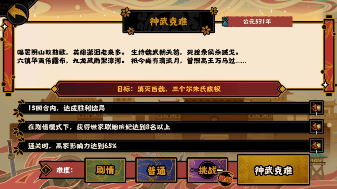 注:如未达成所有次要目标或在剧情模式下通关本剧本,或者达成史实结局,则只能获得【敕勒歌】结局;若同时达成主要和次要目标,则能获得【高王大业】结局并同时解锁【敕勒歌】结局。