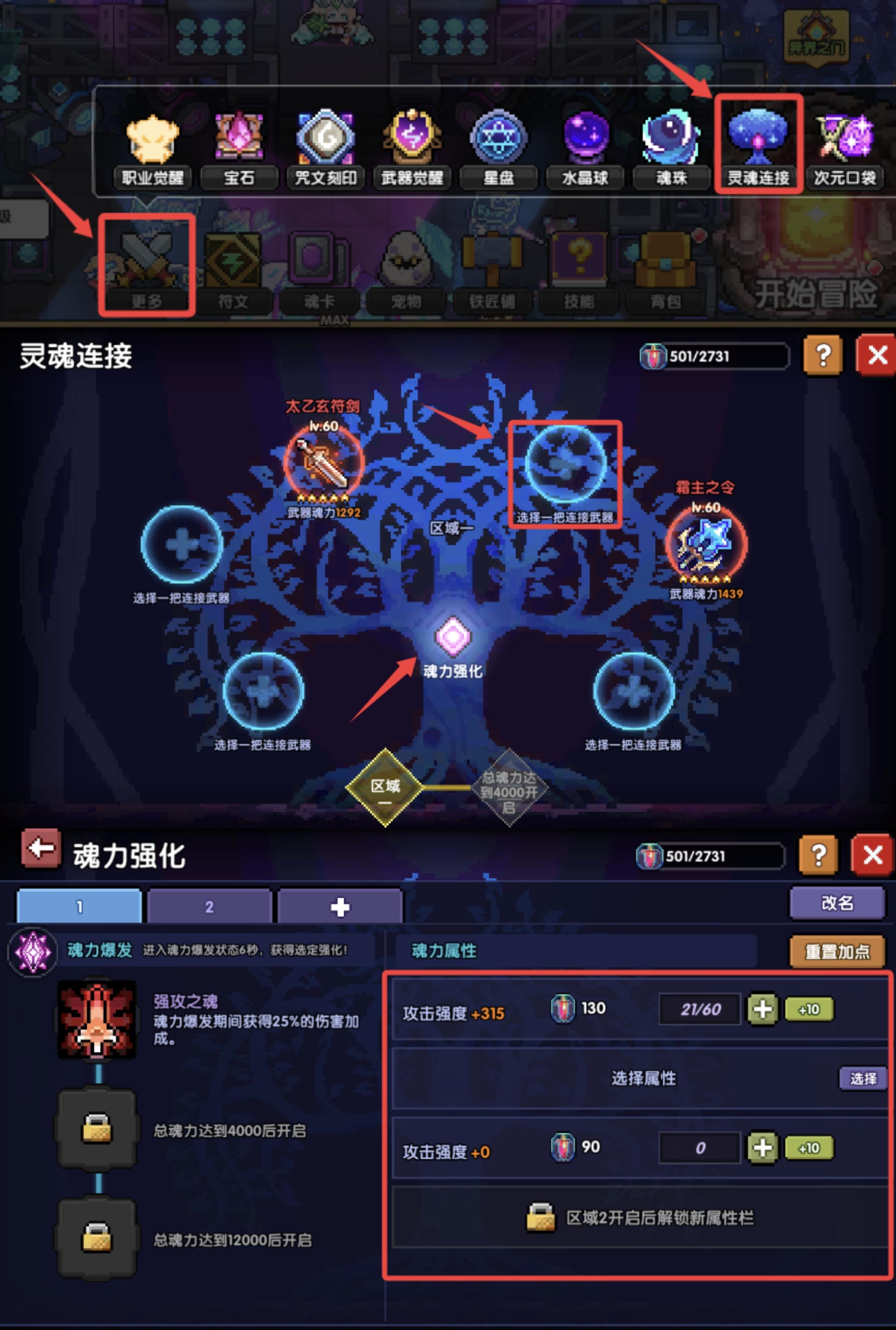 A+级解锁灵魂连接系统,武器具有相应的魂力,将武器镶嵌后可用魂力升级相应选择的属性等。