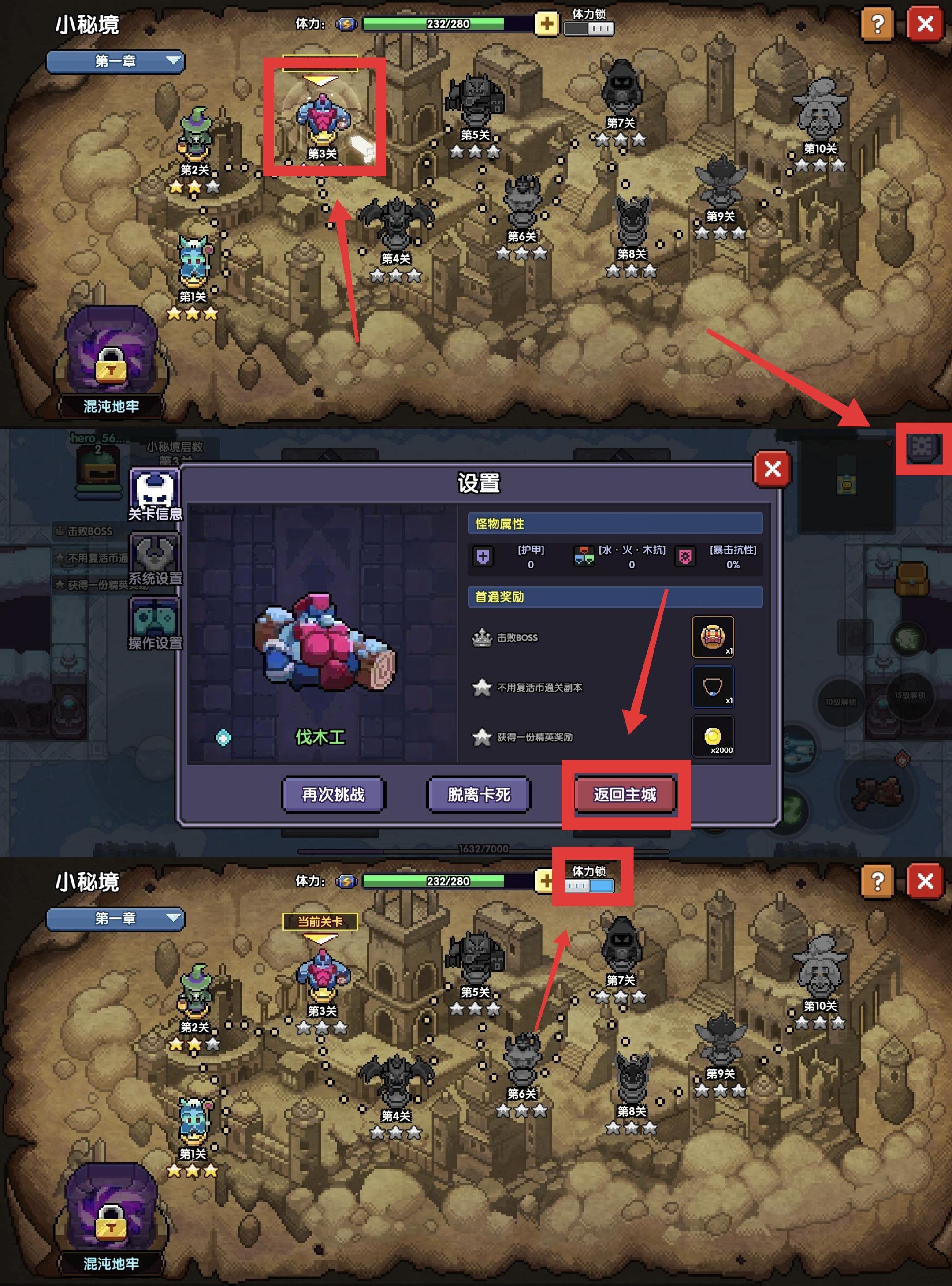 根据指引,我们挑战第3关小秘境时,地图界面将解锁体力锁功能。