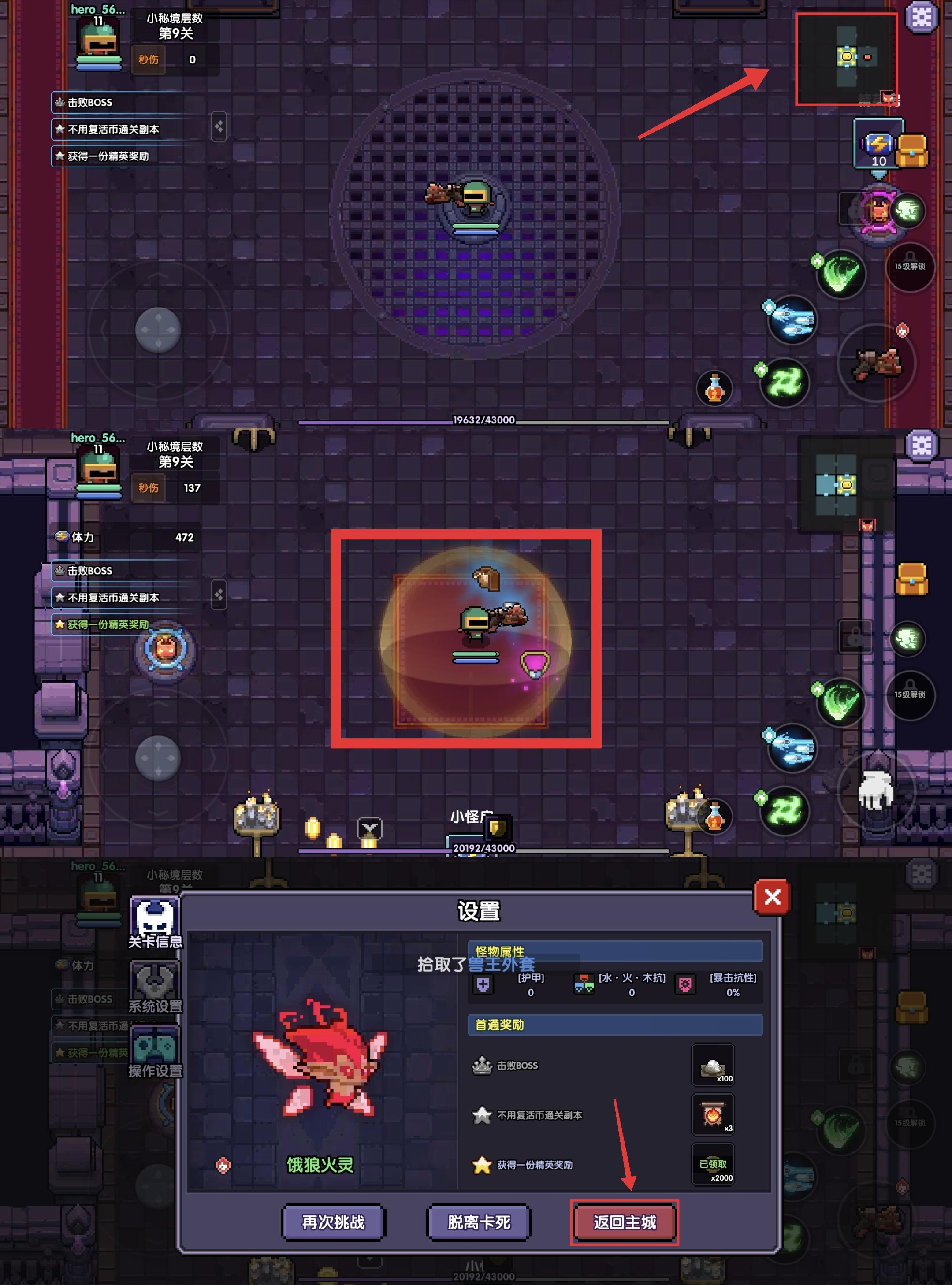 小技巧:暂时关闭体力锁,选择最新关卡进入、右上角设置、再次挑战,直到精英怪房就在门口(如下图所示),进入精英房清理完怪物后打开宝箱并拾取装备,而后退出关卡,装备掉落的装备,再次打开体力锁。