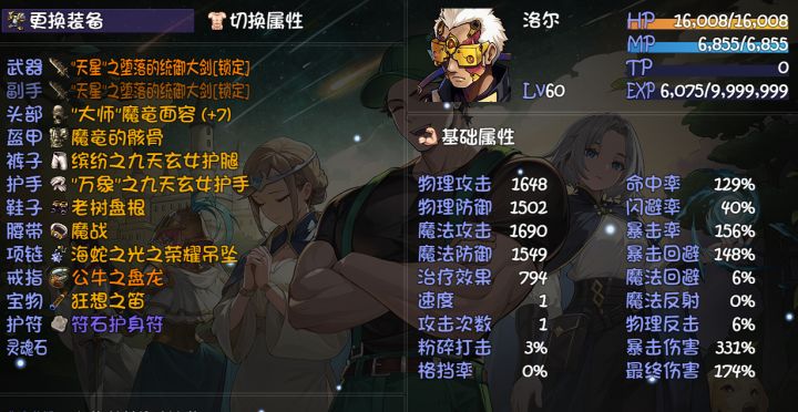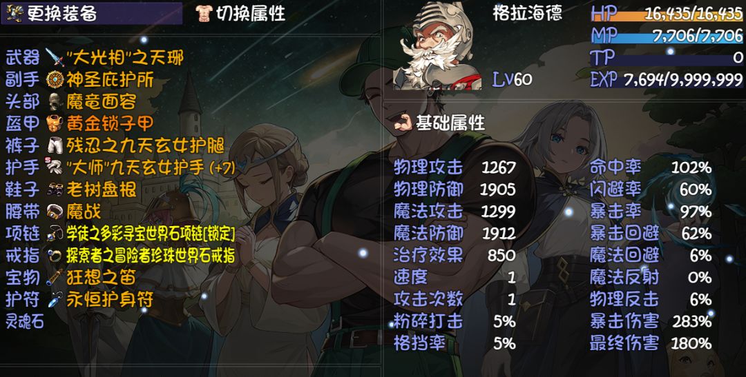 老头主手带减属性剑 副手带光环减伤盾牌,魔龙两件,九天两件