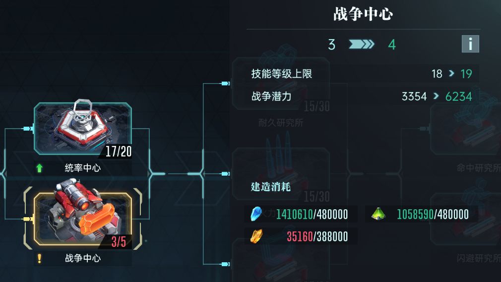 战争中心则是提高英雄的技能等级上限,升到5级之后英雄技能等级才能突破20级。这也是目前所有城建系统中最特殊的一个,升级除了需要虚空原石和暗质精华,还需要消耗原能结晶。