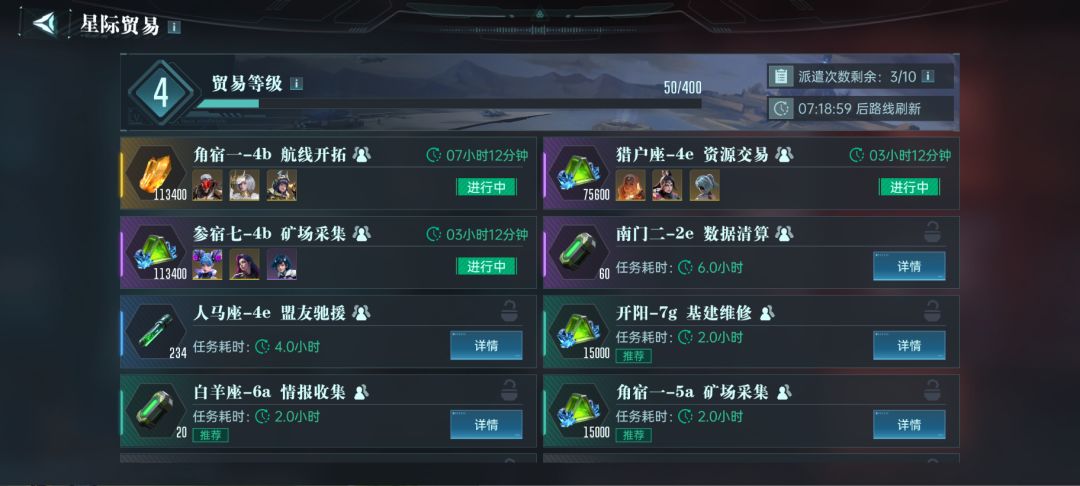 贸易中心则是解锁“星际贸易”玩法,用通俗的话来说就是派遣功能。完成派遣任务之后,可以获得各种稀缺的资源,包含原能结晶、城建资源箱、经验药剂等。同时,如果达成100%任务完成率,还可以获取兵种模组箱和备用军械。